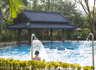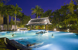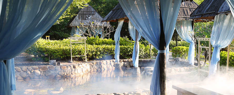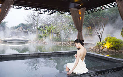 此處流水潺潺、錦鯉暢游的小溪兩旁,有10座巴厘島風(fēng)格小亭,這就是我們的“巴厘風(fēng)韻”區(qū)。“巴厘風(fēng)韻”區(qū)充滿了東南亞情調(diào),溫泉水溫度有的38度,有的40度,還有的42度。每個(gè)溫泉池一半露天,另一半被小亭遮蓋,在這里,您可以泡在露天部分仰望藍(lán)天,與星星月亮調(diào)侃,也可以泡在燈光柔和的小亭底下或與情人竊竊私語(yǔ),或與朋友同事暢敘人生。